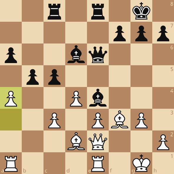 De gatenkaas in de witte stelling verraadt wat er zo ongeveer gebeurd is: e4 Pg1 dus en even later weer exf3 en passant, een zet die op veel afkeuring kon rekenen in de zaal. Het was ook niet de allerbeste maar het idee was met actief stukkenspel al die zwakke velden beschieten en dat is aardig gelukt. Wat nu volgt is een simpele afwikkeling. 23…Lxf3 24.Dxf3 b4 25.cxb4 (instructief detail: 25.dxc5 Le5!) cxb4. Die pion is niet te stoppen, wit loopt een bak tempo’s achter in het centrum om het nog echt lastig te maken. 26.Tac1 Da2! en daar stond binnen no time een Q op b1.
