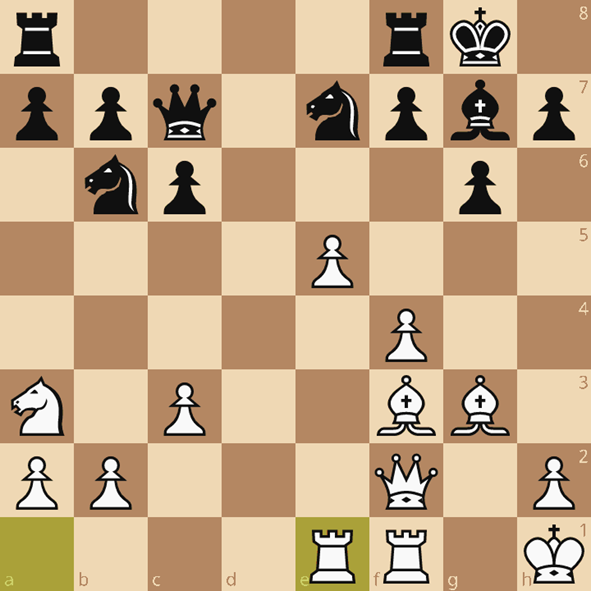 Nu is het definitief uit, na 19…Le7 staat het “gelijk” wat zoveel betekent als dat zwart nog een loeizware taak heeft om de stelling te verdedigen.