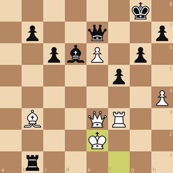 Dit was de laatste kans om Pc2 te spelen, en dan op Dd2 Df1. De structuur van wit maakt dat hij de meeste eindspellen geruisloos verliest, dus hij moet leven van de aanval. 26…Dd2 27.Te2?? Dxf4.Ik zou hier graag zeggen dat de rest techniek was, maar in tijdnood werd het alsnog spannend.