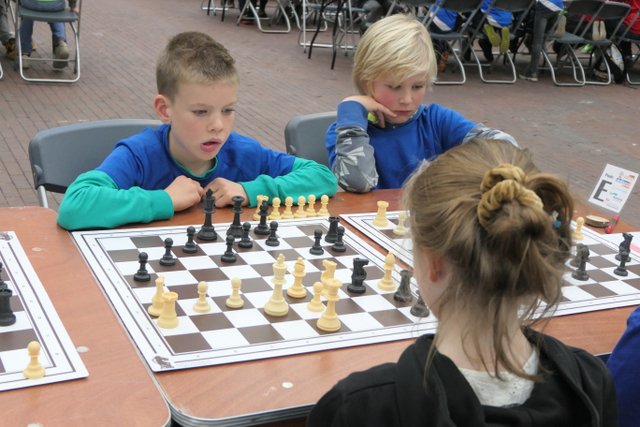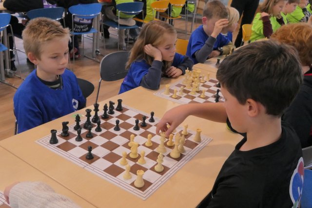o De begeleider helpt de kinderen de juiste schaaktafel te vinden en vult de namen van de kinderen op de uitslagenbriefjes in.