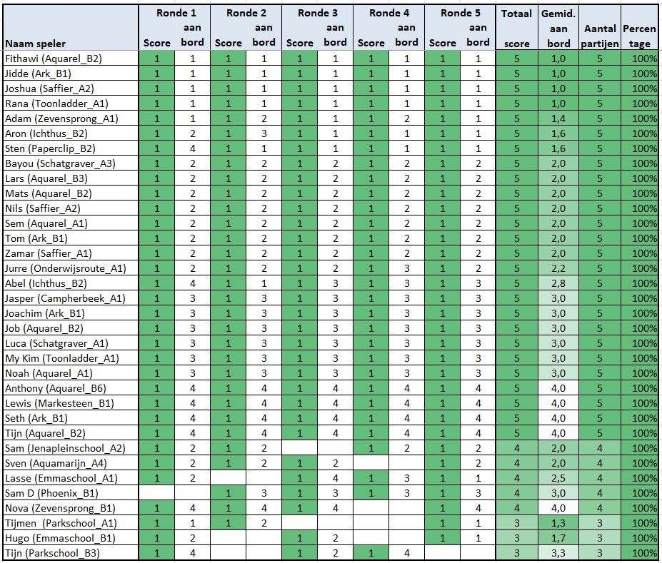 Van deze 472 deelnemers haalden 34 spelers een perfecte score van 100%. Van Fithawi, Jidde, Joshua en Rana is dat extra knap, want zij speelden aan het eerste bord van hun team. Op het eerste bord ontmoeten zij de sterkste tegenstanders. De teams Ark B1 en Aquarel B2 wisten de perfecte score op alle borden in alle ronden te halen.
