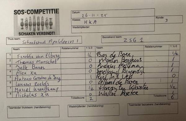 De uitslag van de match werd een vette 2-6, zwaar geflatteerd maar wie maalt daar om. René had zich als kapitein der troepen weer opgeofferd in het teambelang, op bord 5 deze keer. Ik sluit niet uit dat we die partij nog kunnen bewonderen in een verslag van de tegenstanders.