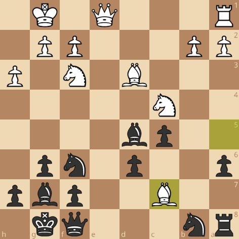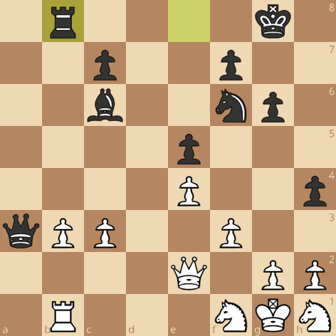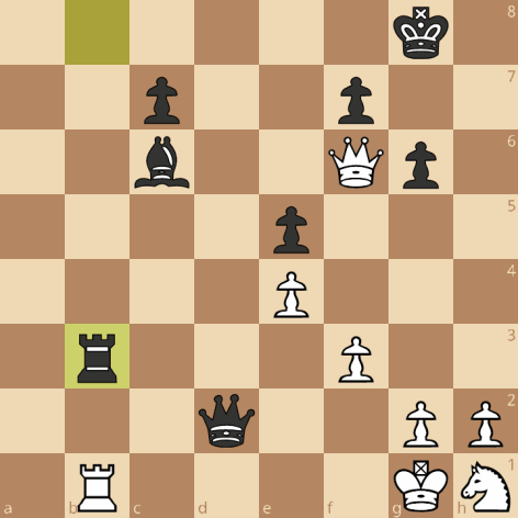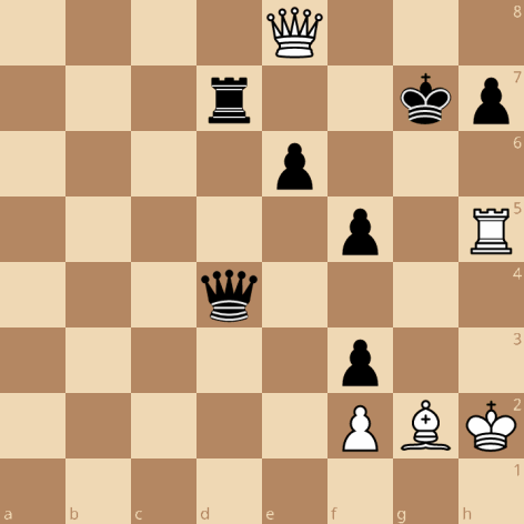 Het niet zo handige 29.Pd2 vergooit hier het laatste beetje voordeel: 29…Dc5+ 30.Df2 Dxc3 31.Dxh4 en als ik nu iets als Pd7 of Kg7 moet doen is het ook al prima speelbaar, maar er is beter: 31…Dxd2 32.Dxf6 Txb3!